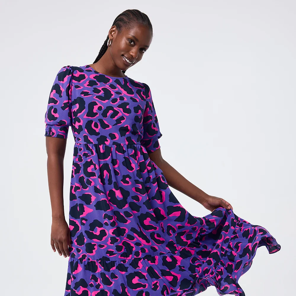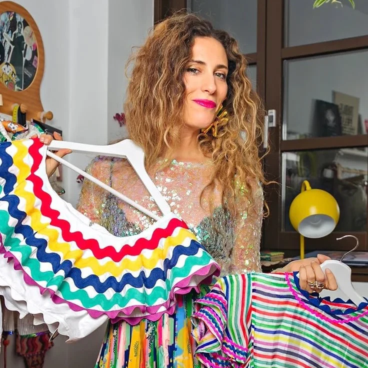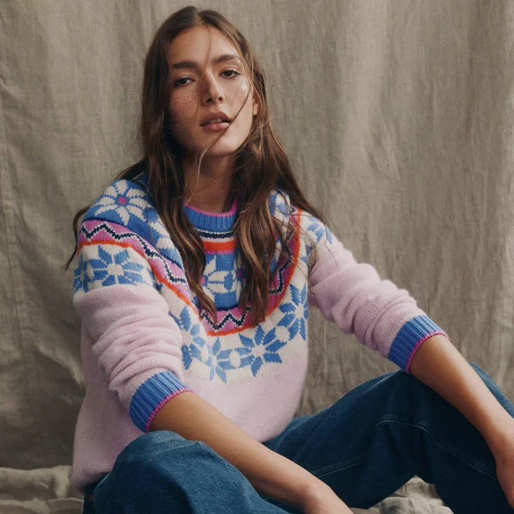 rosie parsons sits outside a pink cafe wearing a pink jumper with red heart and red skirt and pink high heels